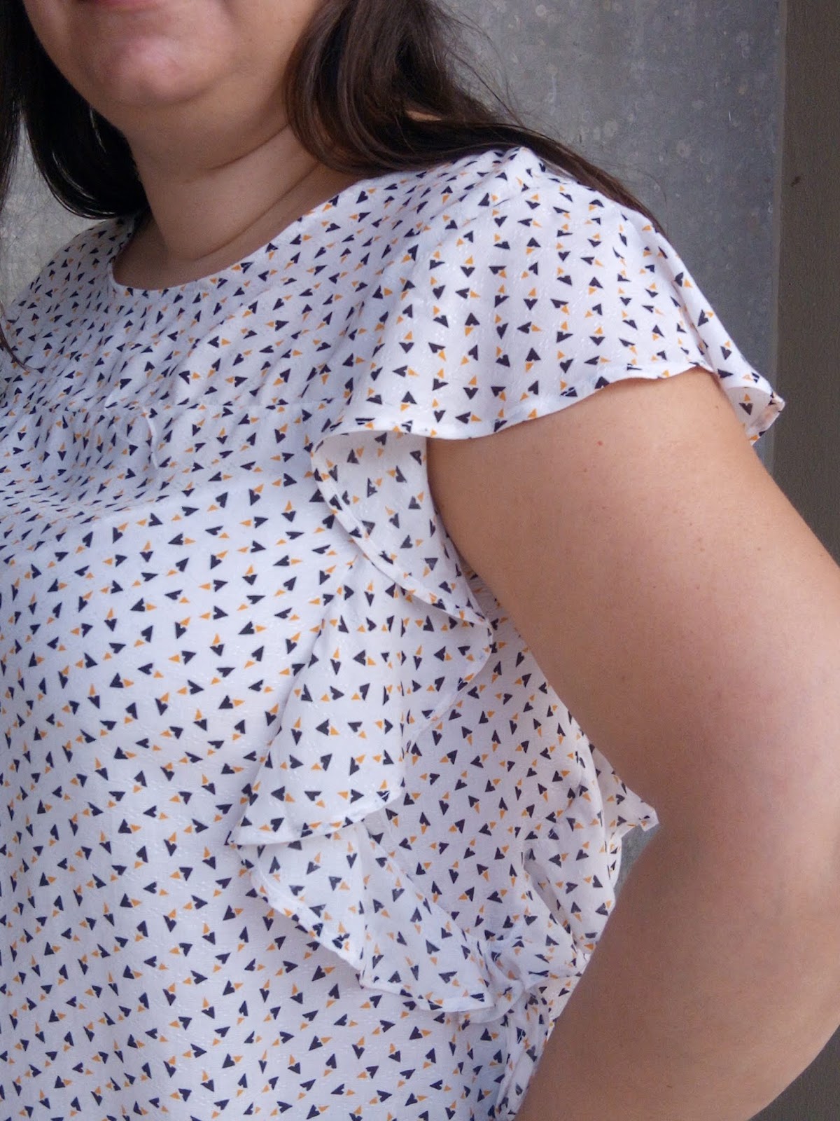 Tinha este retalho que comprei na Feira dos Tecidos. A minha irmã queria folhos nas mangas.